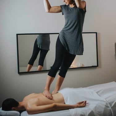 A deep pressure massage where the therapist uses controlled foot techniques to release tension and relax tight muscles.